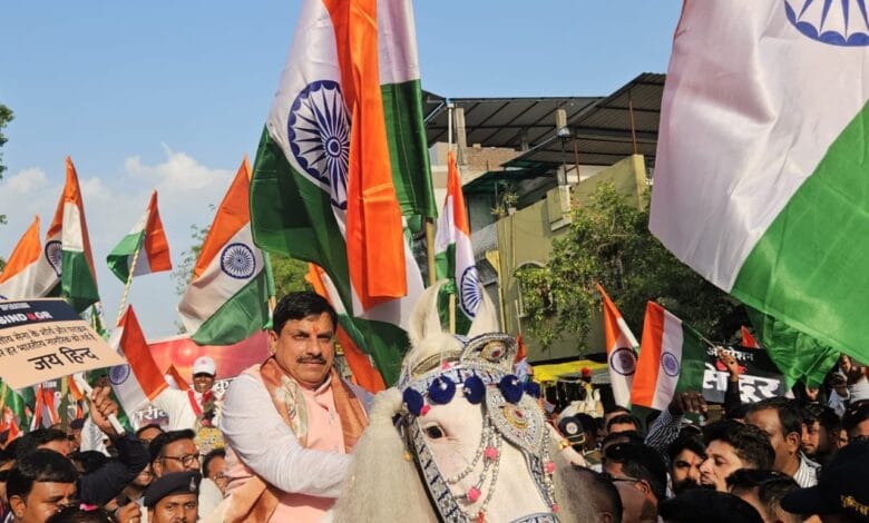 उज्जैन। भारतीय सेना द्वारा आतंकियों के विरूद्ध की गई ऑपरेशन सिंदूर की सफलता पर भारतीय सेना के शौर्य एवं पराक्रम के प्रति आभार व्यक्त करने के लिए शुक्रवार को शहर में भव्य तिरंगा यात्रा का आयोजन किया गया। मुख्यमंत्री डॉ. मोहन यादव शहीद पार्क से प्रारंभ हुई भव्य तिरंगा यात्रा में शामिल हुए। मुख्यमंत्री डॉ. यादव ने शहीद पार्क स्थित जय स्तम्भ पर शहीदों को श्रध्दांजली अर्पित कर घोड़े पर सवार होकर तिरंगा यात्रा की शुरूआत की ।
